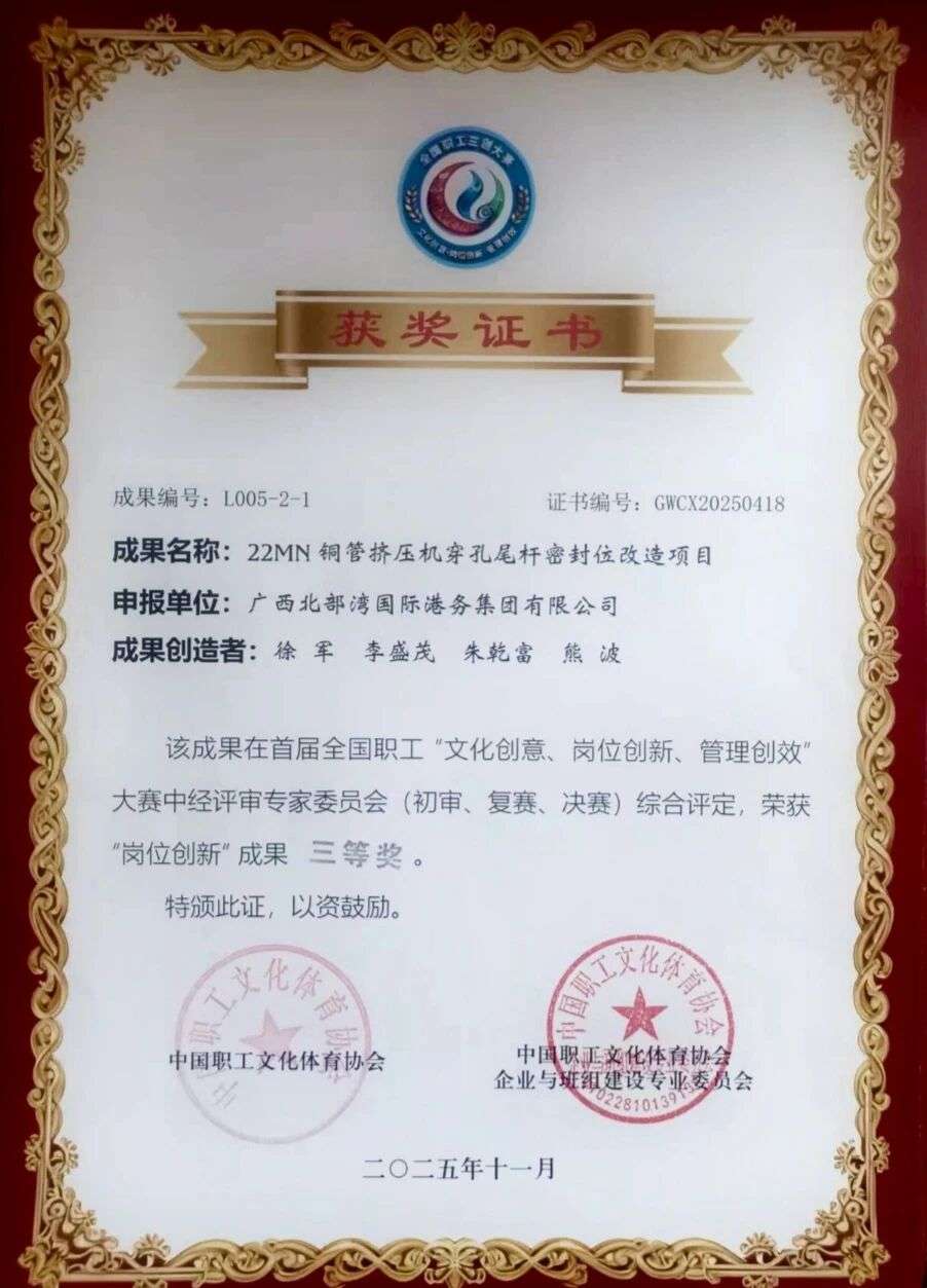 在“岗位创新”赛道,桂林漓佳公司《22MN铜管挤压机穿孔尾杆密封位改造》项目脱颖而出,荣获三等奖。该项目针对设备长期存在的密封系统易磨损、泄漏频发等难题,通过优化密封结构、选用新型材料和完善安装工艺,实现了技术突破,并获得国家实用新型专利。