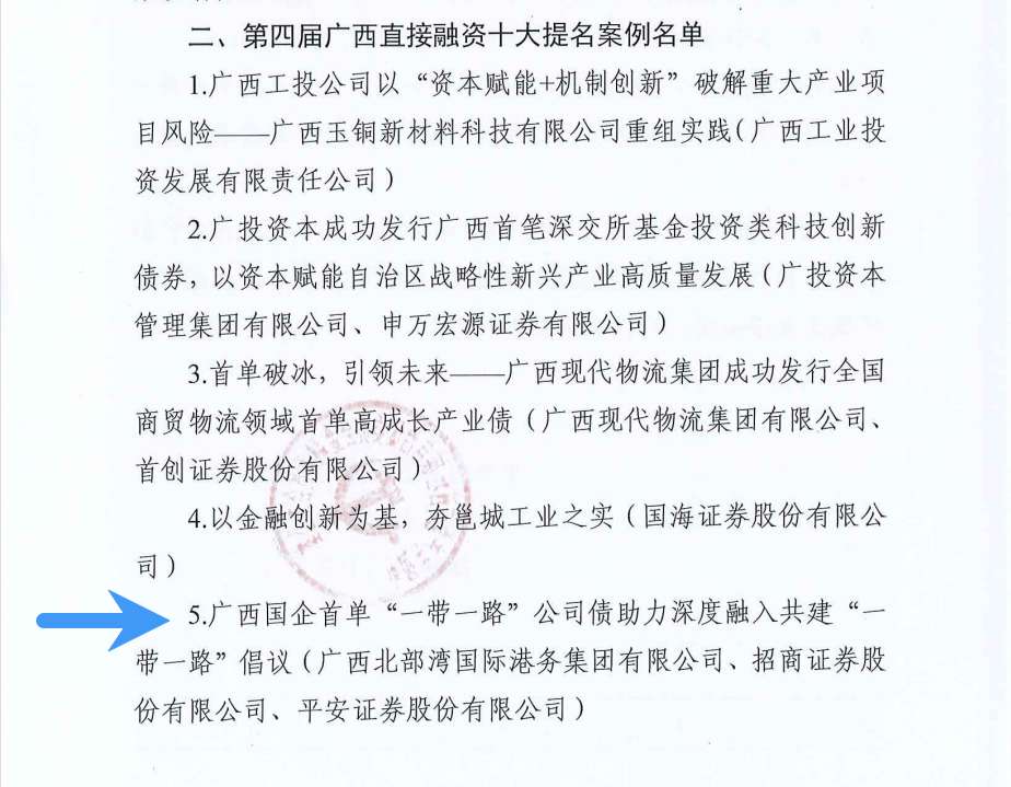 近日,自治区党委金融办公布了第四届广西直接融资十大典型案例及提名案例的评选结果,北部湾港集团《创新构建“基金群”融资模式,引入金融活水赋能广西产业升级》《广西国企首单“一带一路”公司债助力深度融入共建“一带一路”倡议》成功入选。这是2020年广西开展直接融资典型案例评选工作以来,北部湾港集团连续四年入选“广西直接融资十大典型案例”名单,表明了市场对北部湾港集团长期以来积极参与资本市场、探索创新直接融资模式、服务向海经济发展,加快培育战略核心产业的高度认可。