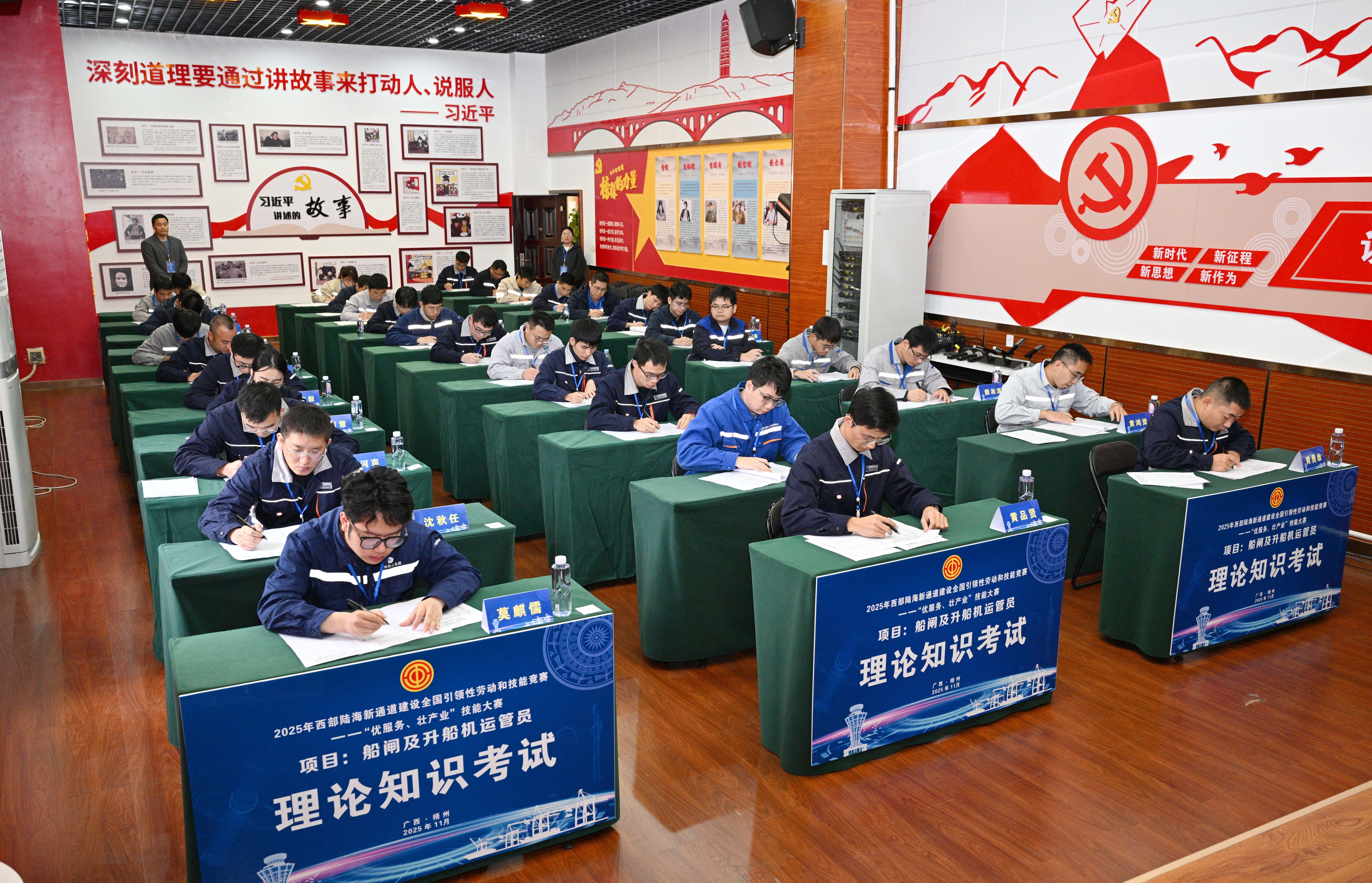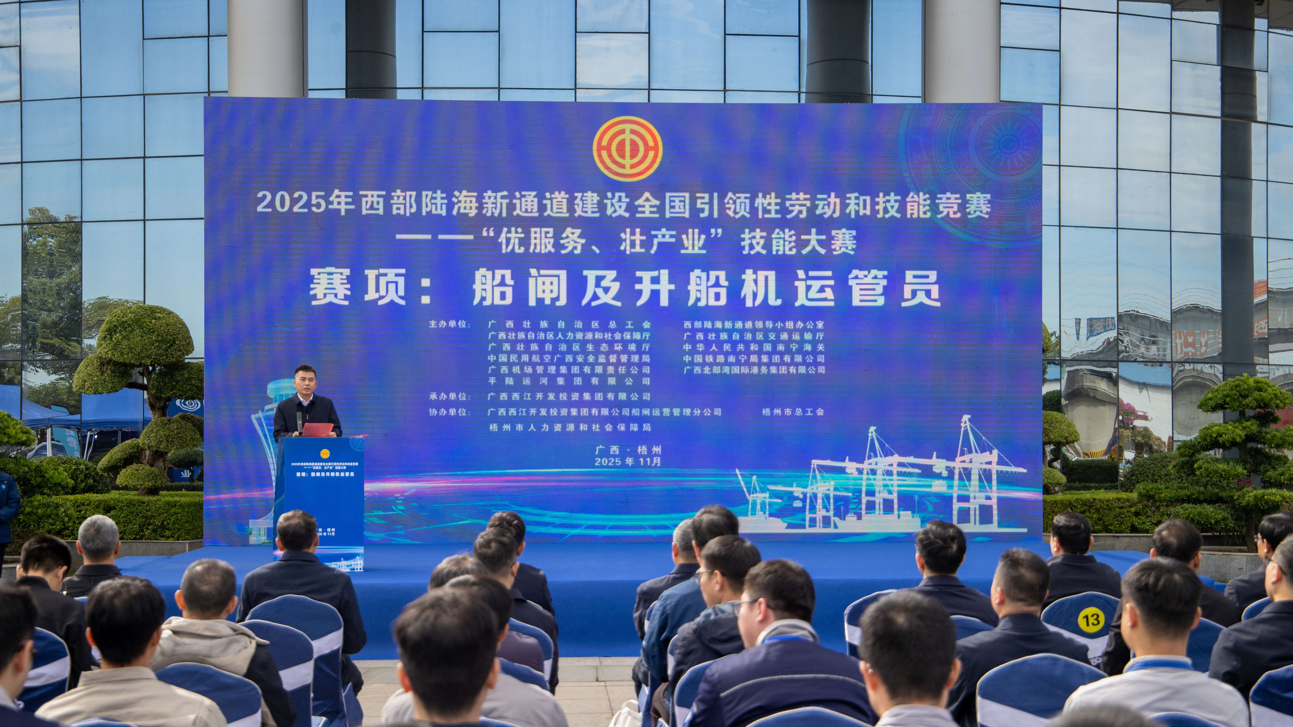 通道竞技展身手,扬帆西江向未来。11月19日至21日,2025年西部陆海新通道建设全国引领性劳动和技能竞赛——“优服务、壮产业”技能大赛船闸及升船机运管员赛项在“全国十佳明星船闸”长洲船闸火热开赛,吸引了南宁、柳州、贵港、梧州等7个地市的8家单位、17座船闸共34名技术技能精英同台竞技。自治区总工会党组成员、副主席苏琰凌,中国航海学会船闸专委会主任委员包文全,北部湾港集团党委副书记、职工董事、工会主席汪旭,平陆运河集团党委副书记、纪委书记、职工董事、工会主席顾黎等领导嘉宾出席开幕式。