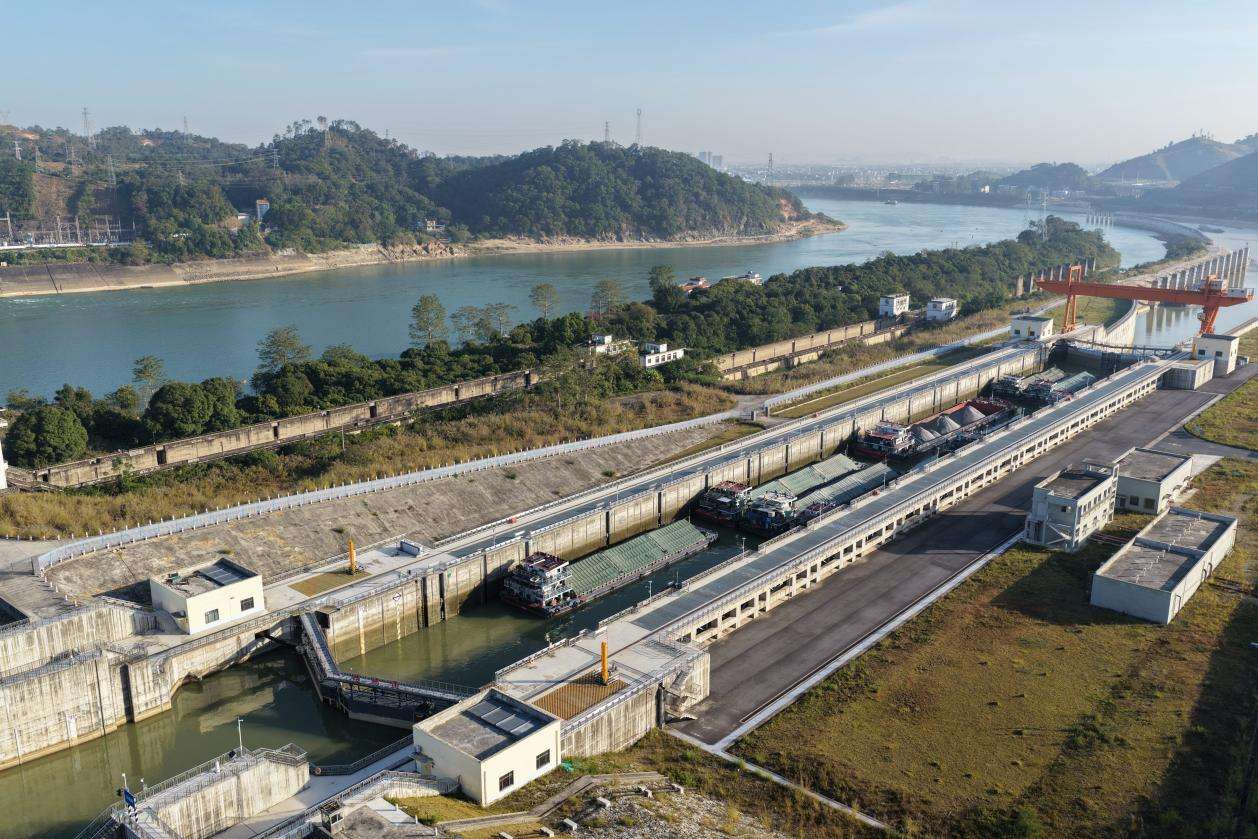 三年来,西津二线船闸通航能力实现了跨越式提升。3000吨级船舶已实现常态化通行,最大过闸船舶达4200吨,较原有一线船闸(1000吨级)实现大幅跨越。截至2025年12月15日,船闸过货量达2549万吨,同比增长15%,有效保障区域大宗货物运输需求。此外,西津二线船闸与平陆运河马道枢纽锚地高效衔接,初步构建“江海直达”物流网络,为红水河、柳黔江流域及贵州船舶提供更优出海通道。