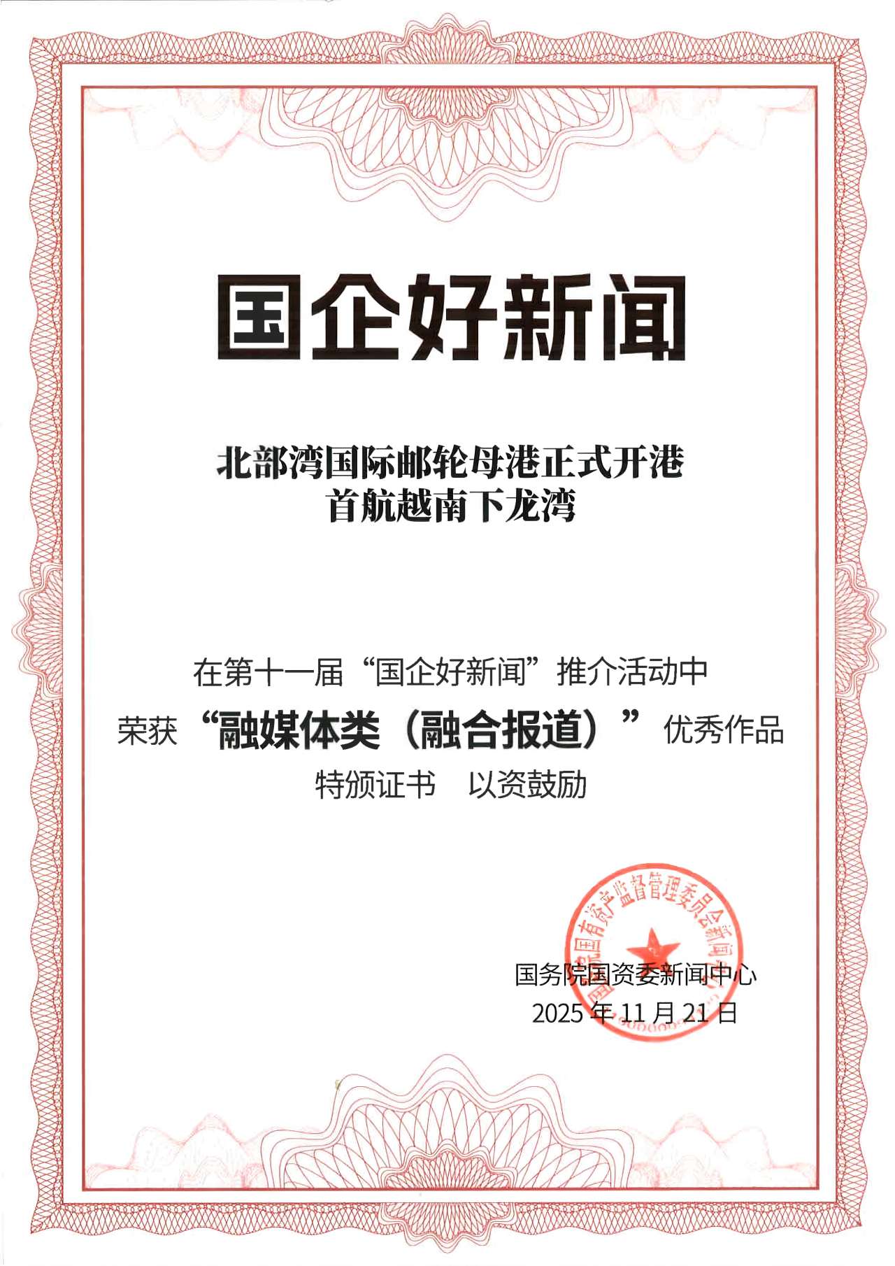 北部湾港集团融媒体系列报道荣获第十一届“国企好新闻”奖