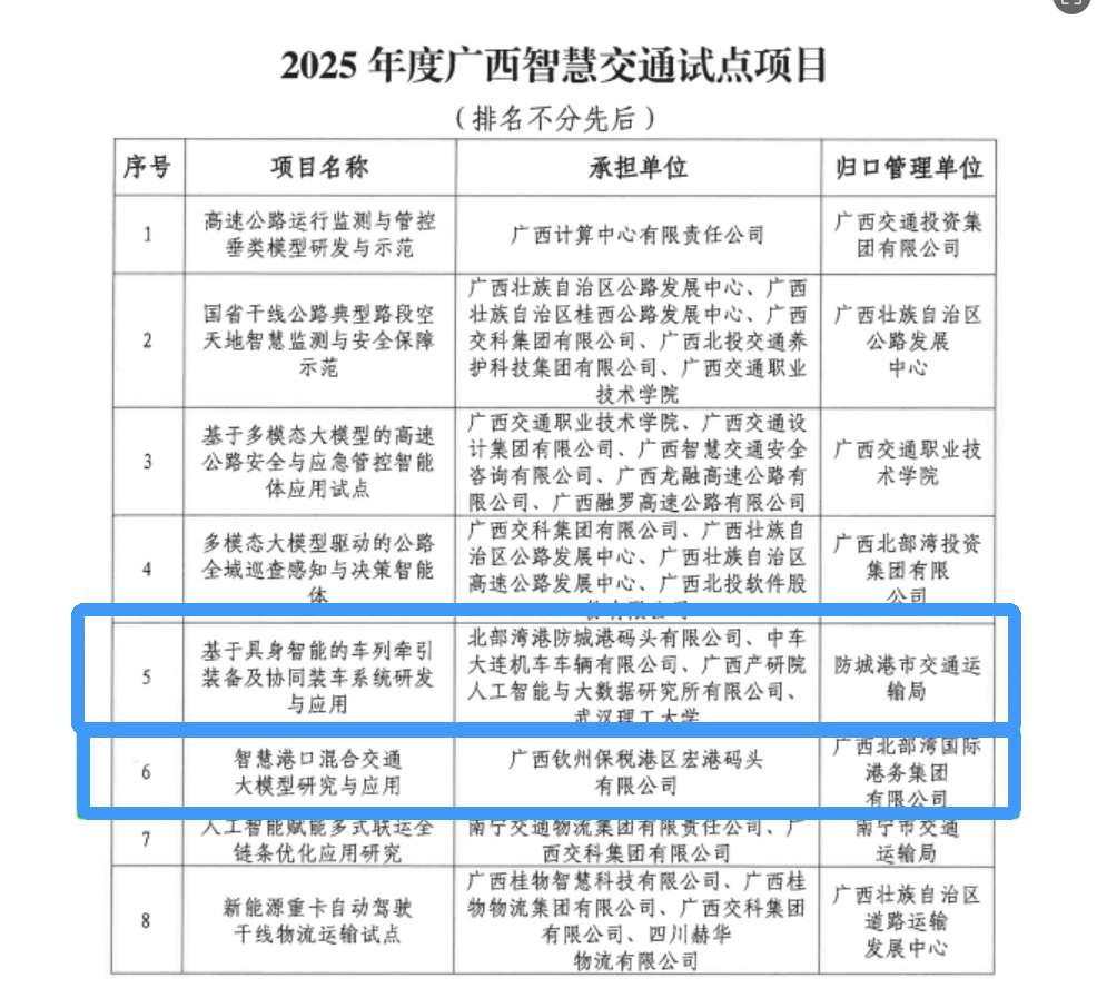 近日,自治区交通运输厅正式公布2025年度广西智慧交通试点项目名单,北部湾港集团旗下北部湾港股份防城港码头、宏港码头项目成功入选,成为智慧港口领域试点标杆。其中,宏港码头“智慧港口混合交通大模型研究与应用”项目还获评2025年度广西“首字号”科技创新重大成果,标志着该项目在技术创新与行业应用层面获得官方权威认可,为广西智慧交通建设注入新动力。