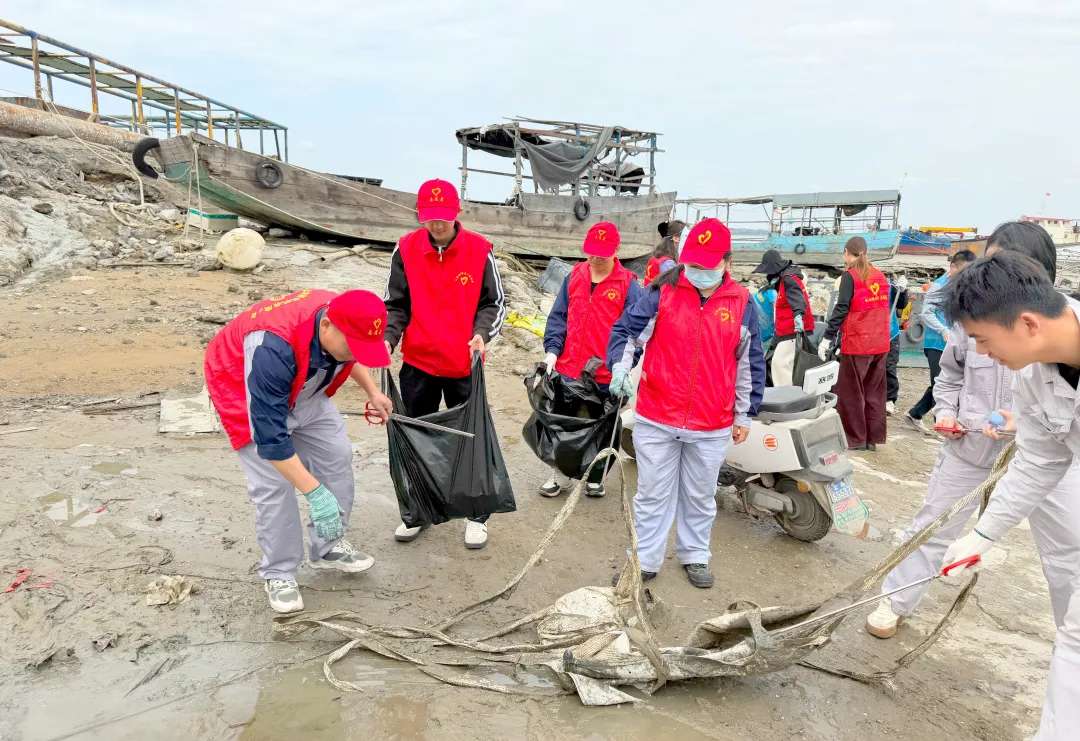 在铁山港区兴港镇林春码头,北港新材料组织志愿者开展海滩垃圾清理行动,大家手持钳子、垃圾袋,沿着海岸线细致搜寻,以实际行动守护“碧海银滩”。