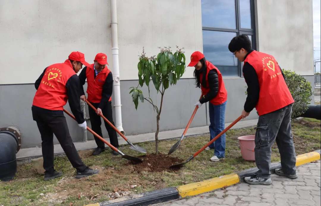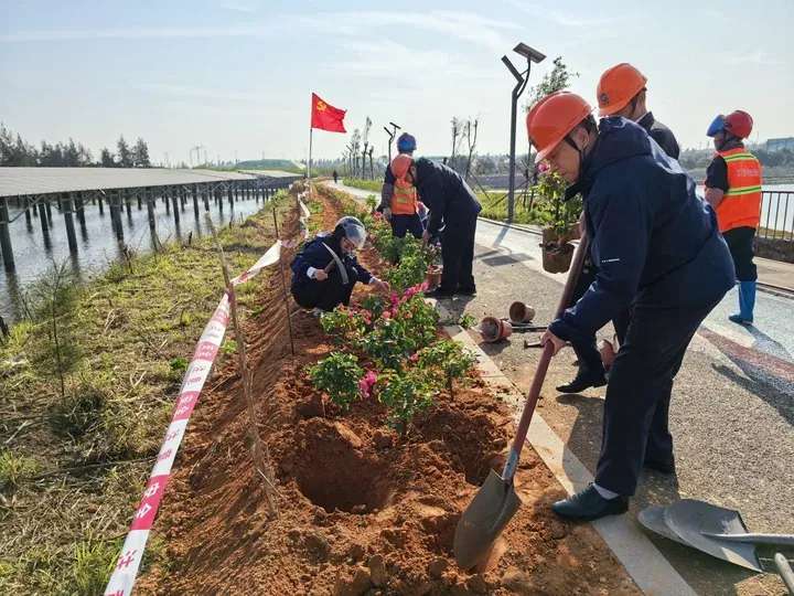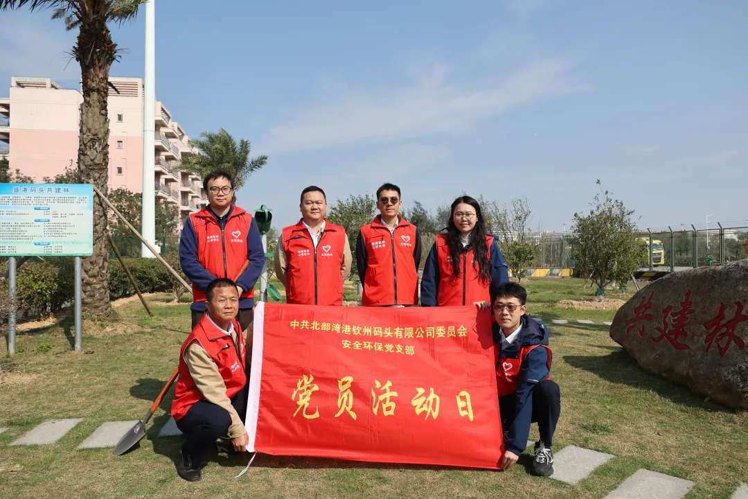 北港物流在西部陆海新通道钦州、北海联运中心,挥锹铲土,种下朱槿花、桃花和荔枝树苗。大家三五成群,分工协作,扶苗、培土、浇水,配合默契,共建绿色美好园区。