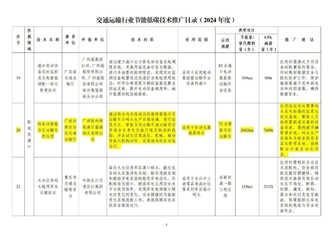 近期,交通运输部发布《交通运输行业节能低碳技术推广目录(2024年度)》,涵盖公路、航道及港口、道路运输、船舶运输等领域共27项先进适用的节能低碳技术。由北部湾港集团旗下广西钦州保税港区盛港码头有限公司申报的《纯电动智能导引运输车的应用》入选,成为广西唯一入选推广目录的技术应用。