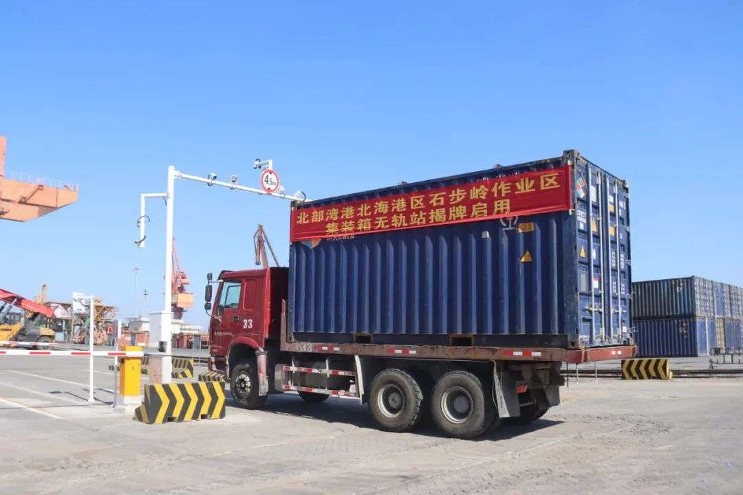 11月29日,随着搭载20英尺集装箱的卡车通过无人闸口进入北部港湾北海港域石步岭作业区402堆场(无轨站),顺利完成卸车、堆箱作业,北部湾港北海港域首个集装箱无轨站正式揭牌启用。
