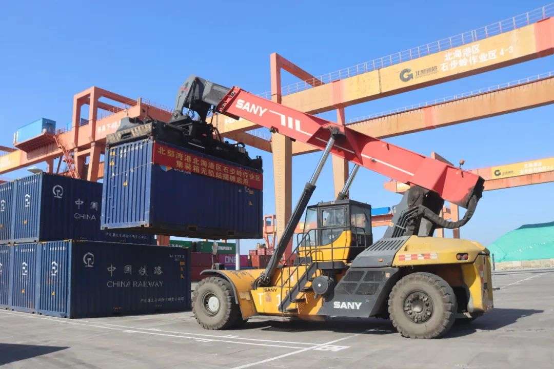 从“通”到“畅”,从“优”到“快”。近年来,北部湾港北海港域坚持加快基础设施建设,不断完善港口配置,带动货物通过能力和服务水平的大幅提升,其中铁路集装箱到发量从2020年的 1.08万标箱,增长到2023年的 12.49万标箱,年均增长率 126.48%,为北部湾港先后完成700万标箱、800万标箱作出贡献。