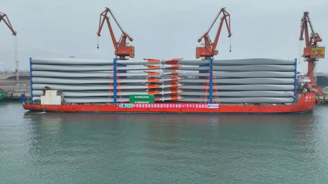 满载着风电叶片的轮船驶离港口
